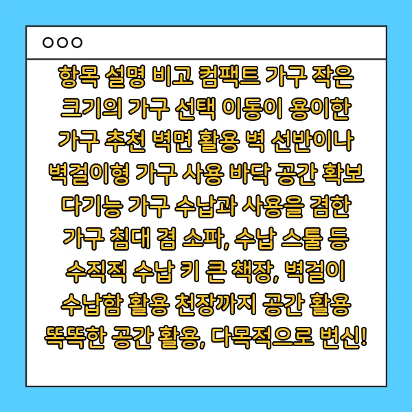항목 설명 비고 컴팩트 가구 작은 크기의 가구 선택 이동이 용이한 가구 추천 벽면 활용 벽 선반이나 벽걸이형 가구 사용 바닥 공간 확보 다기능 가구 수납과 사용을 겸한 가구 침대 겸 소파, 수납 스툴 등 수직적 수납 키 큰 책장, 벽걸이 수납함 활용 천장까지 공간 활용 똑똑한 공간 활용, 다목적으로 변신!